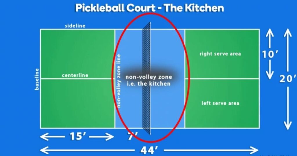 The rules of pickleball doubles rely on the understanding of the court. The sizes of the court are the same in singles and doubles but the arrangement of the players varies greatly. Most of the strategic exchanges are governed by the non-volley zone, which is also known as the kitchen. Players are allowed to go to the kitchen at will, but not to volley when inside the kitchen.